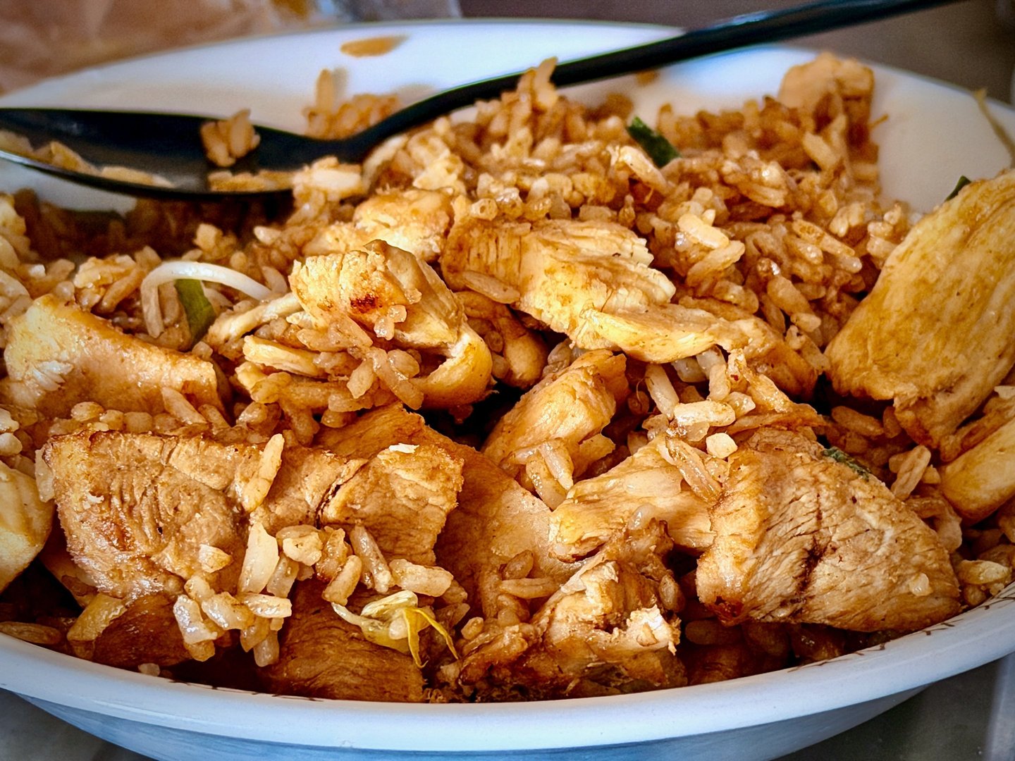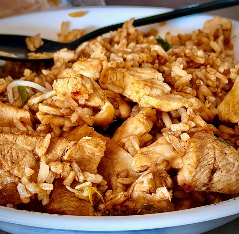 Finalmente tomé una decisión, Bajé el celular, llené el arroz de salsa agridulce, agarré el tenedor y empecé a comer. El arroz estaba delicioso y lo mejor de todo es que ustedes nunca sabrán dónde lo compré.